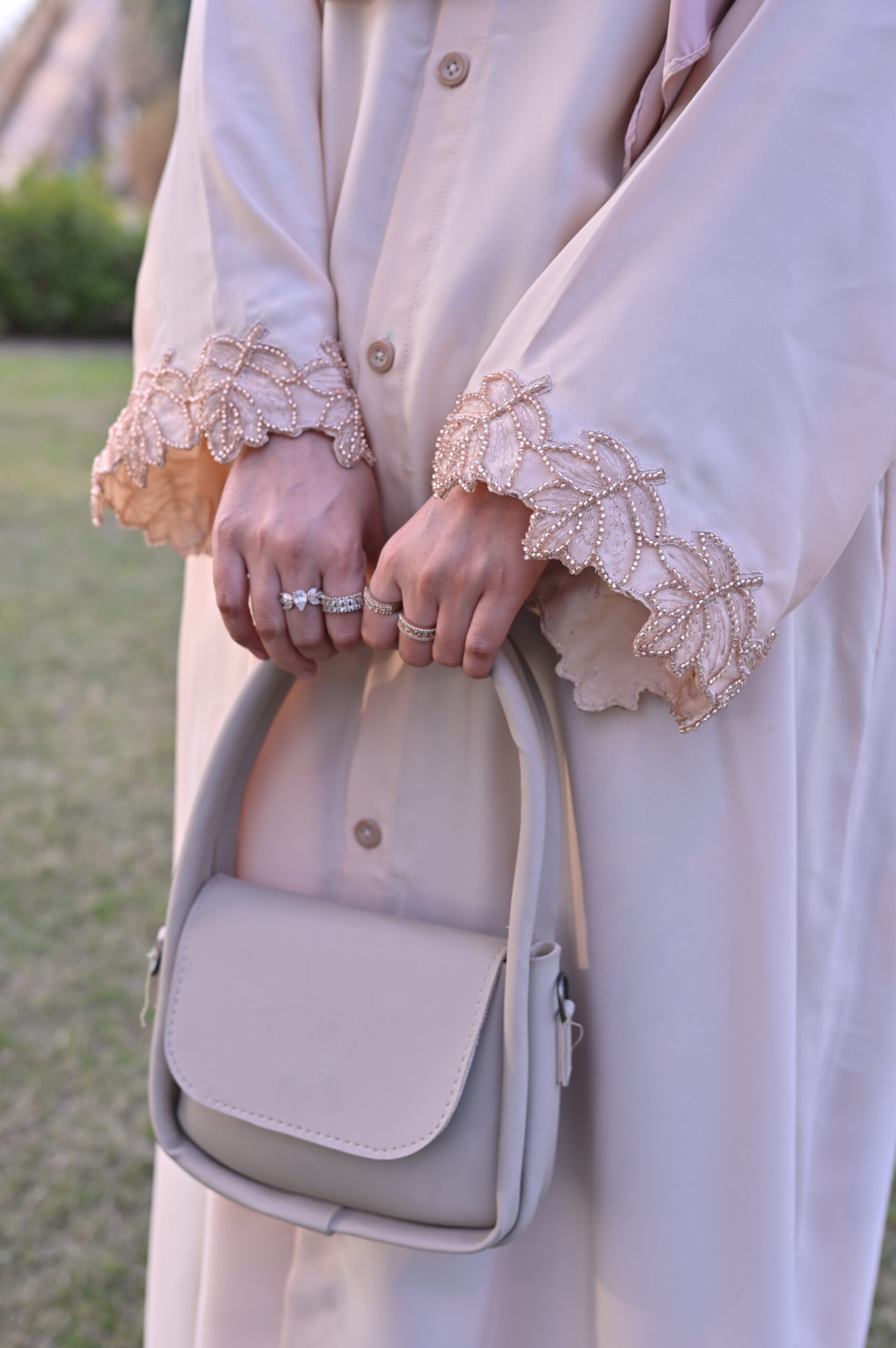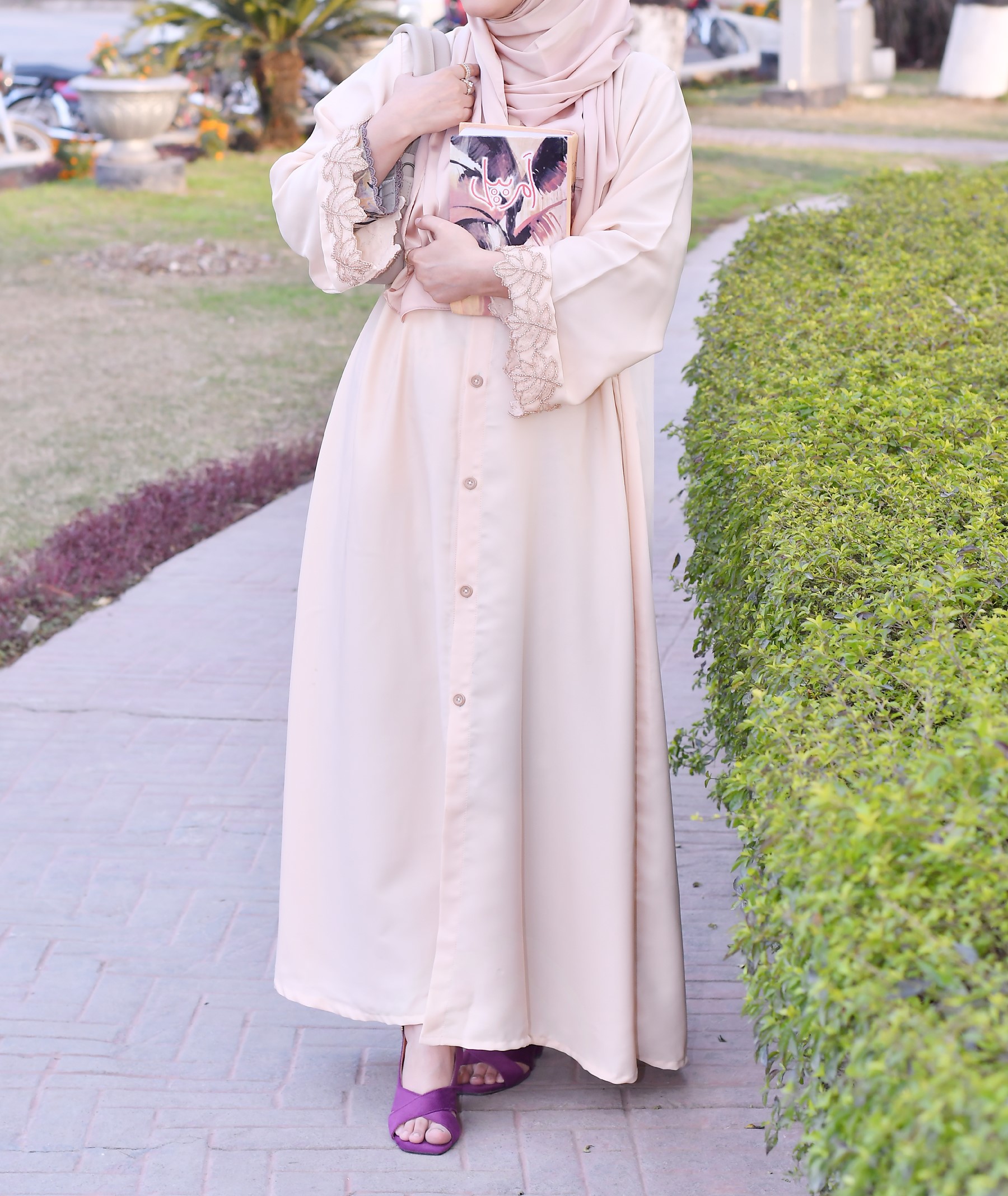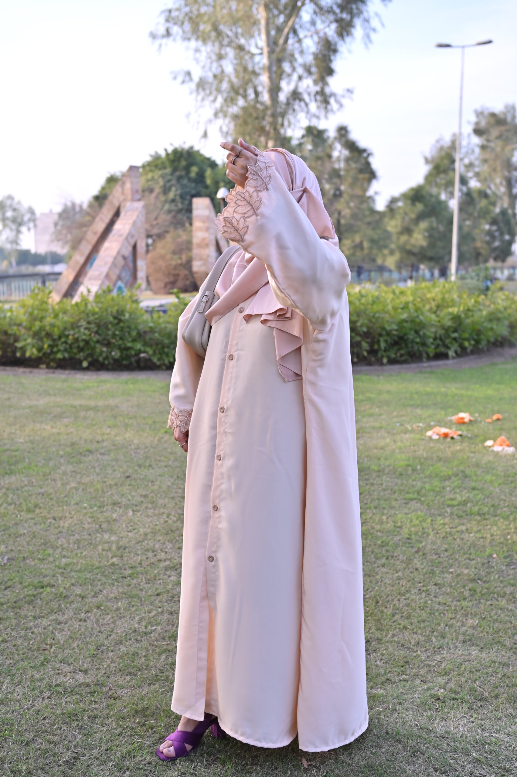 Our abayas are crafted from the finest Nida fabric, ensuring a soft, breathable feel and an elegant drape that lasts all day.