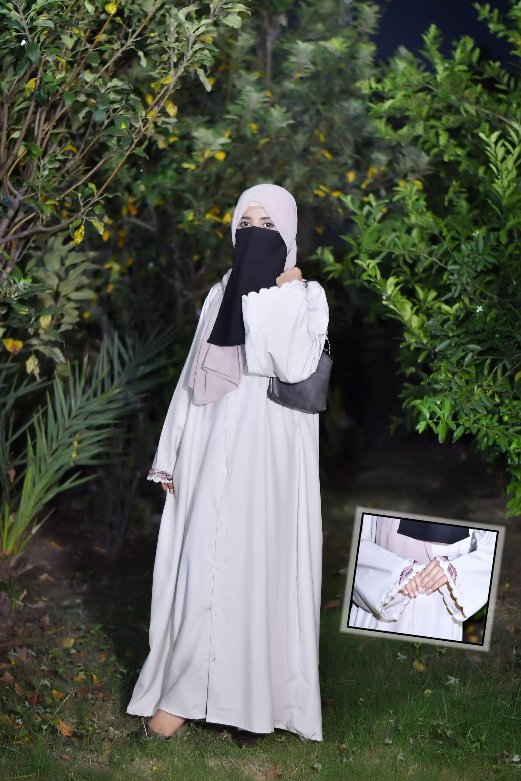This elegant abaya features a soft, creamy beige base that exudes understated sophistication. The standout detail is the intricately embroidered lace cuffs, adorned with delicate floral patterns in white, adding a touch of timeless charm and texture